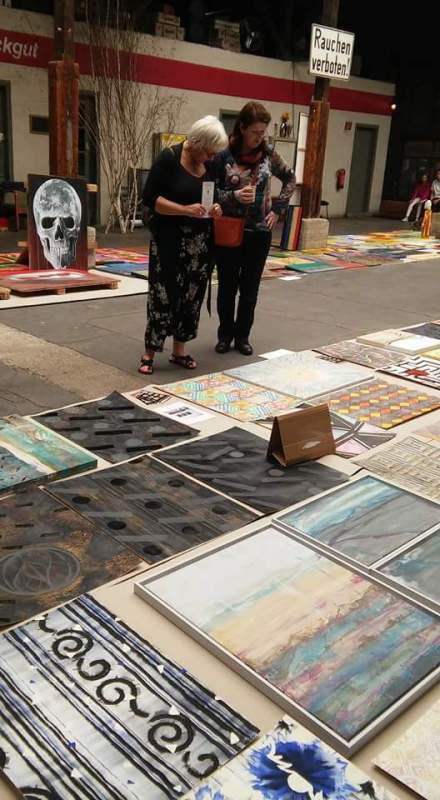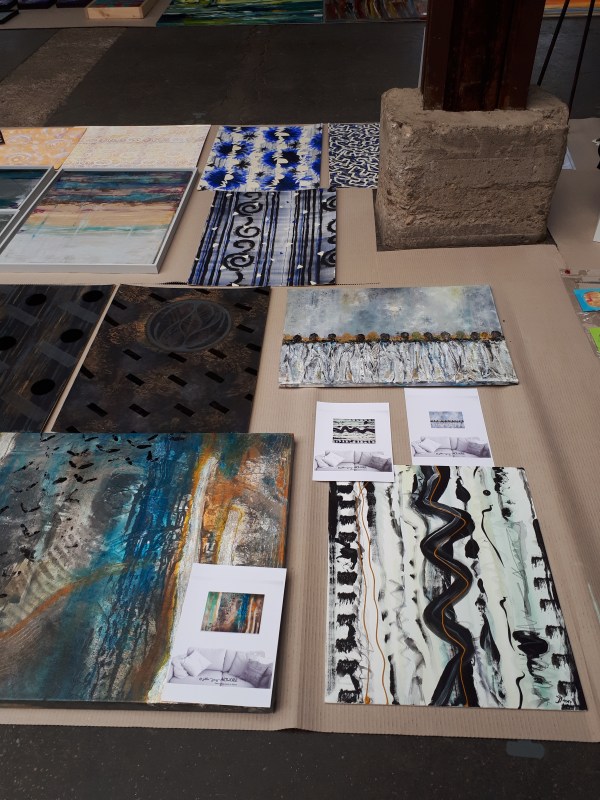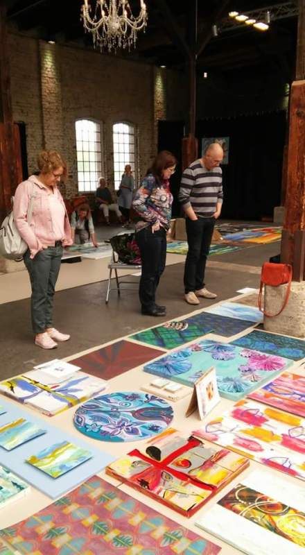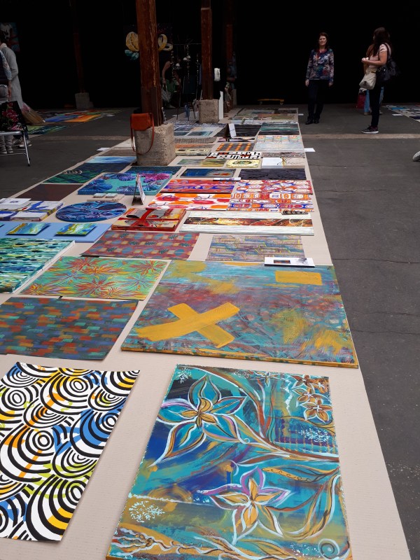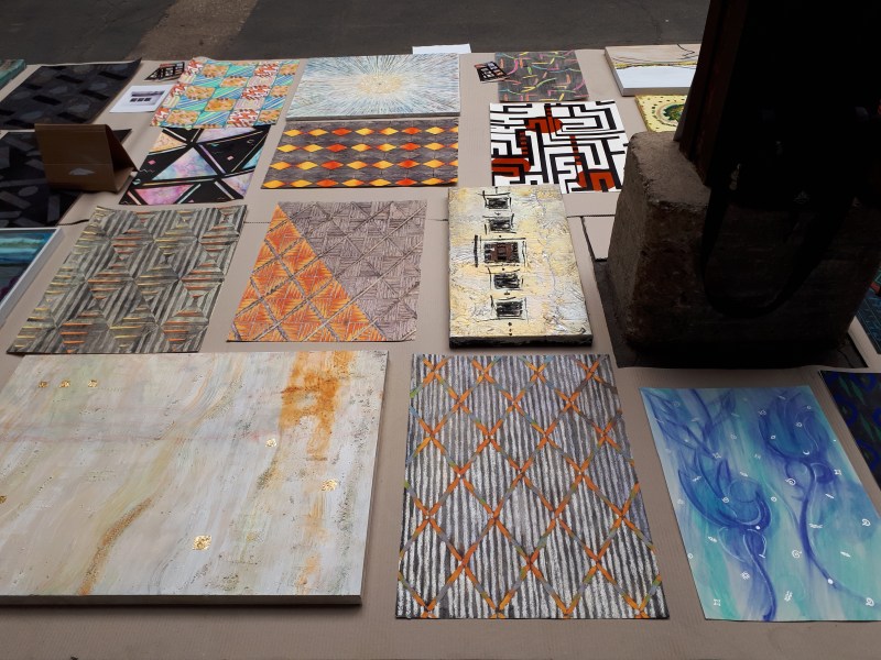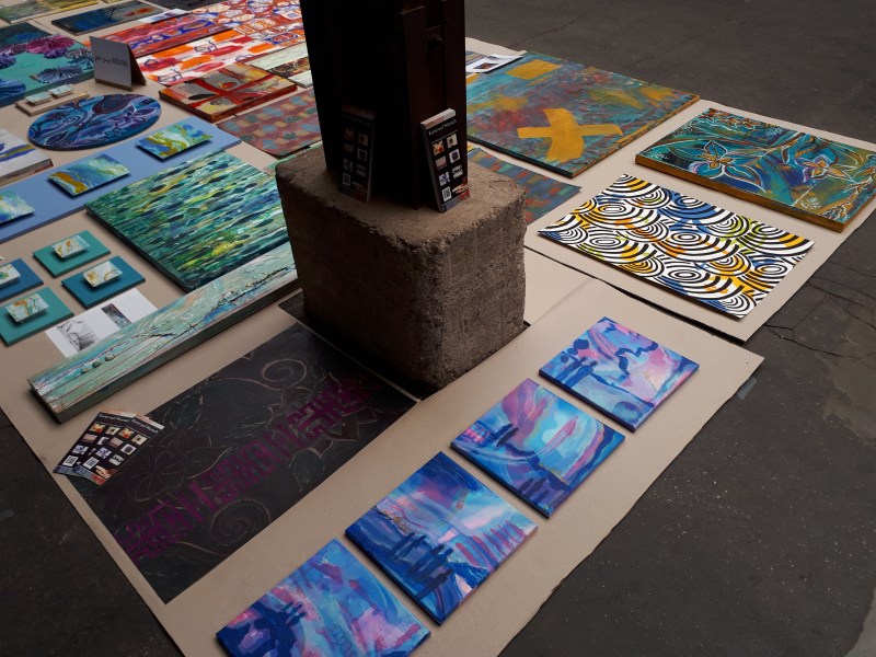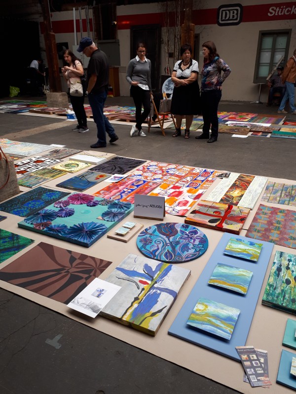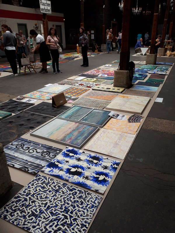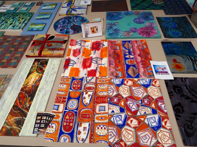 künstlerische Arbeiten ausgelegt wie ein farbenfroher Teppich.
