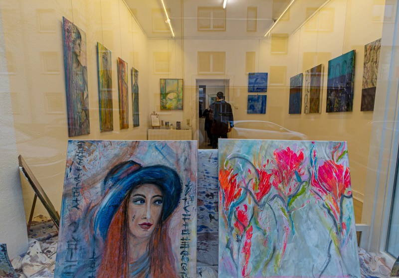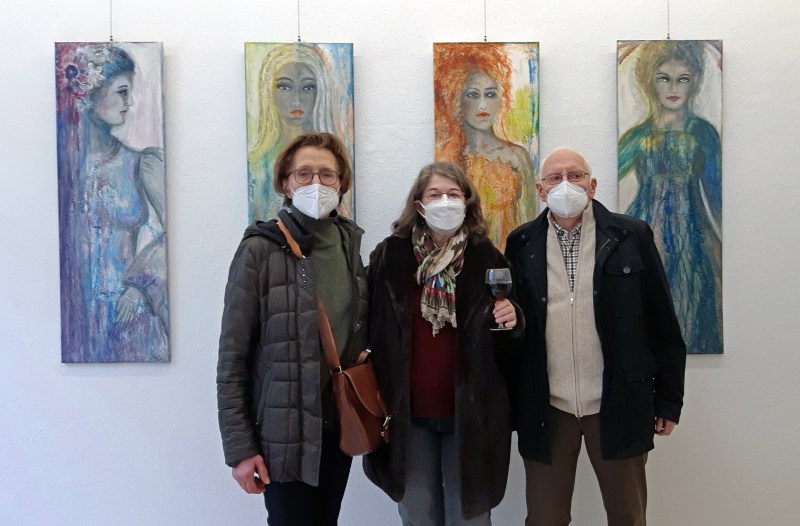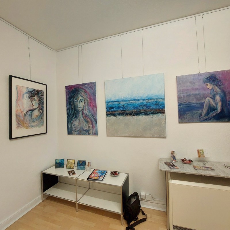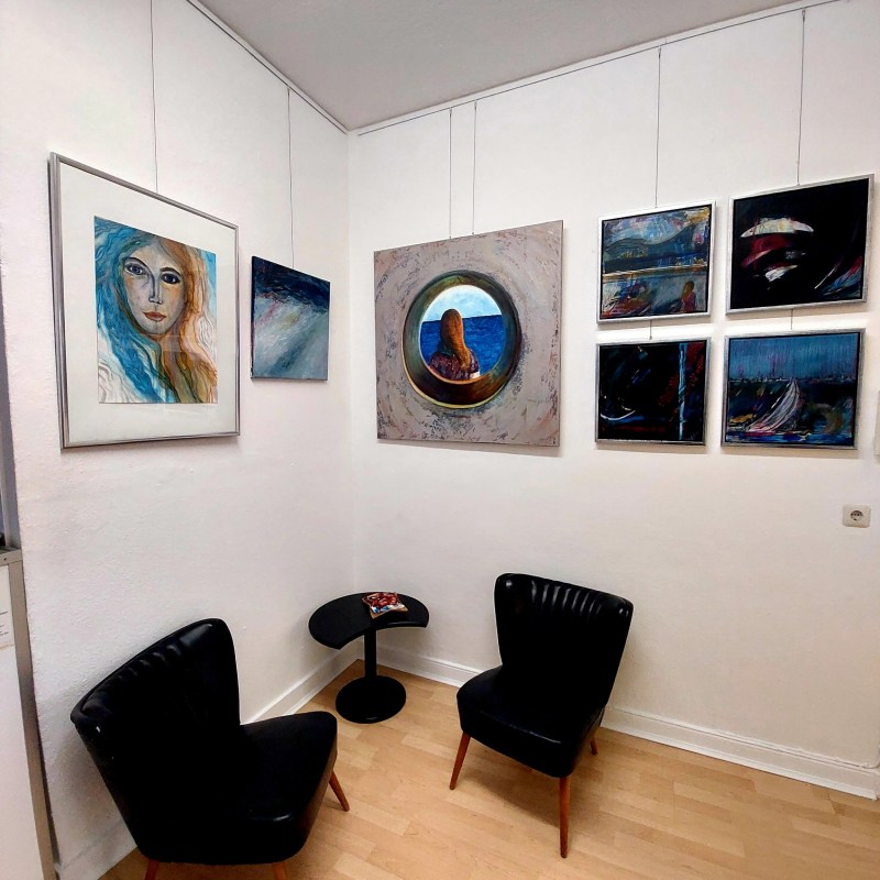 Hinzu kommt ein Auszug aus ihrer Kollektion von „Frauengeschichten und Traumlandschaften“ mit expressiven Porträtzeichnungen und abstrakten Gemälden.