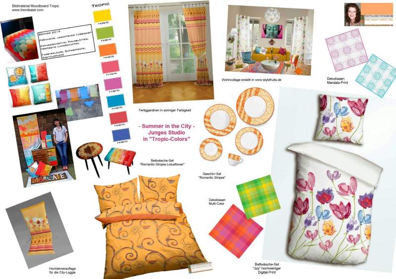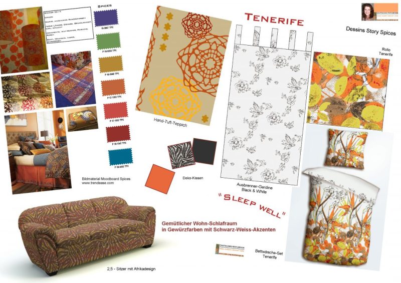 Alle Entwürfe, Textildessins auf den Moodboards und Interior-Simulationen