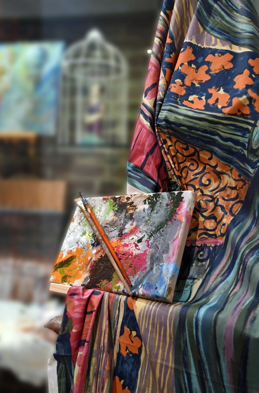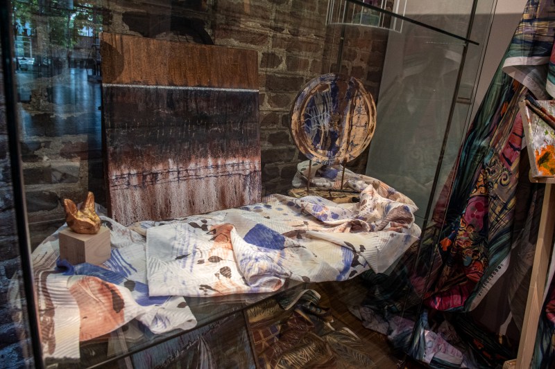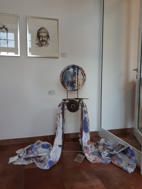 Objektpräsentation im Ballhaus Düsseldorf 2019, Assemblage aus gefundenen Objekten und handbemaltem Stoff, Unikate, handgearbeitet, Copyright Jutta Jung