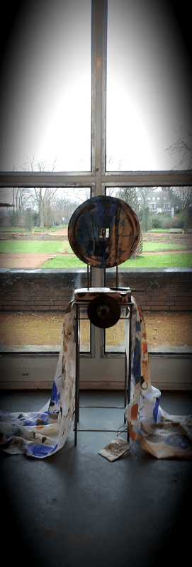 „Zeit kommt – Zeit geht“ Kloster Langwaden 2019. Assemblage aus gefundenen Objekten und handbemaltem Stoff, Unikate, handgearbeitet, Copyright Jutta Jung